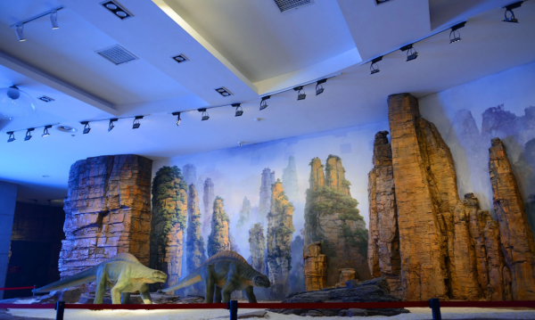 一楼是地质馆,由地球厅、张家界地貌厅、园区珍稀动物展示区等组成,展示张家界地貌特征、以芙蓉龙为代表的古生物化石、有亚洲基因库之称的多样性生物标本。